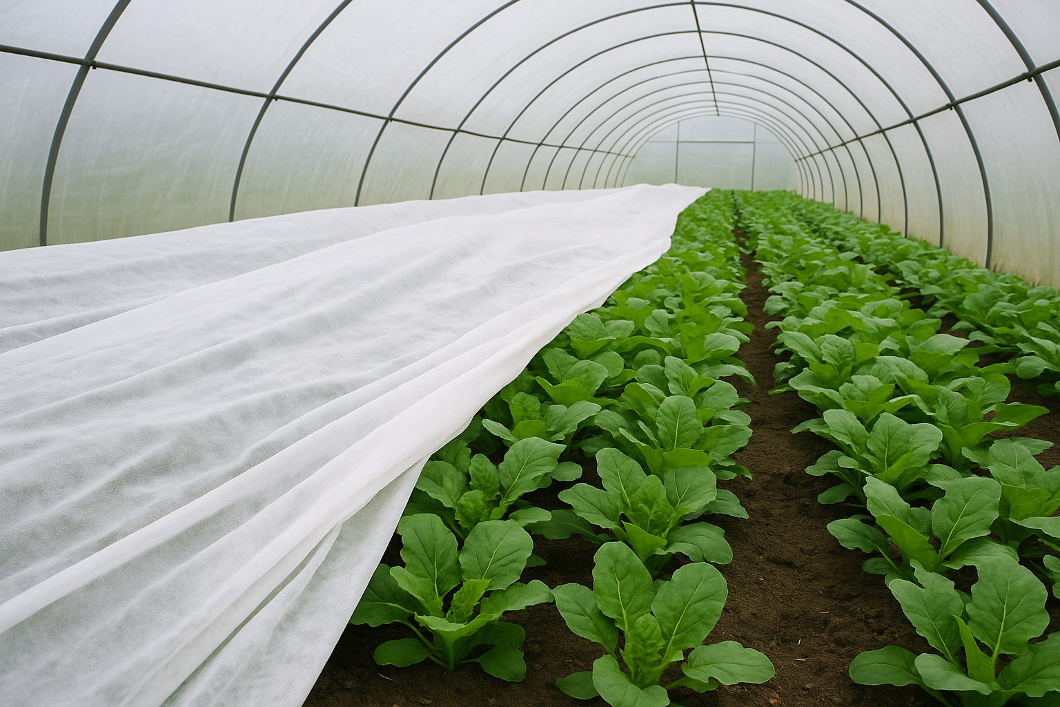 Folia AGRIL de 5,3 m lățime se așază ușor peste straturi sau structuri de susținere, protejând plantele atunci când nopțile sunt reci sau vremea este instabilă. Lumina pătrunde uniform, iar plantele rămân aerisite și protejate.